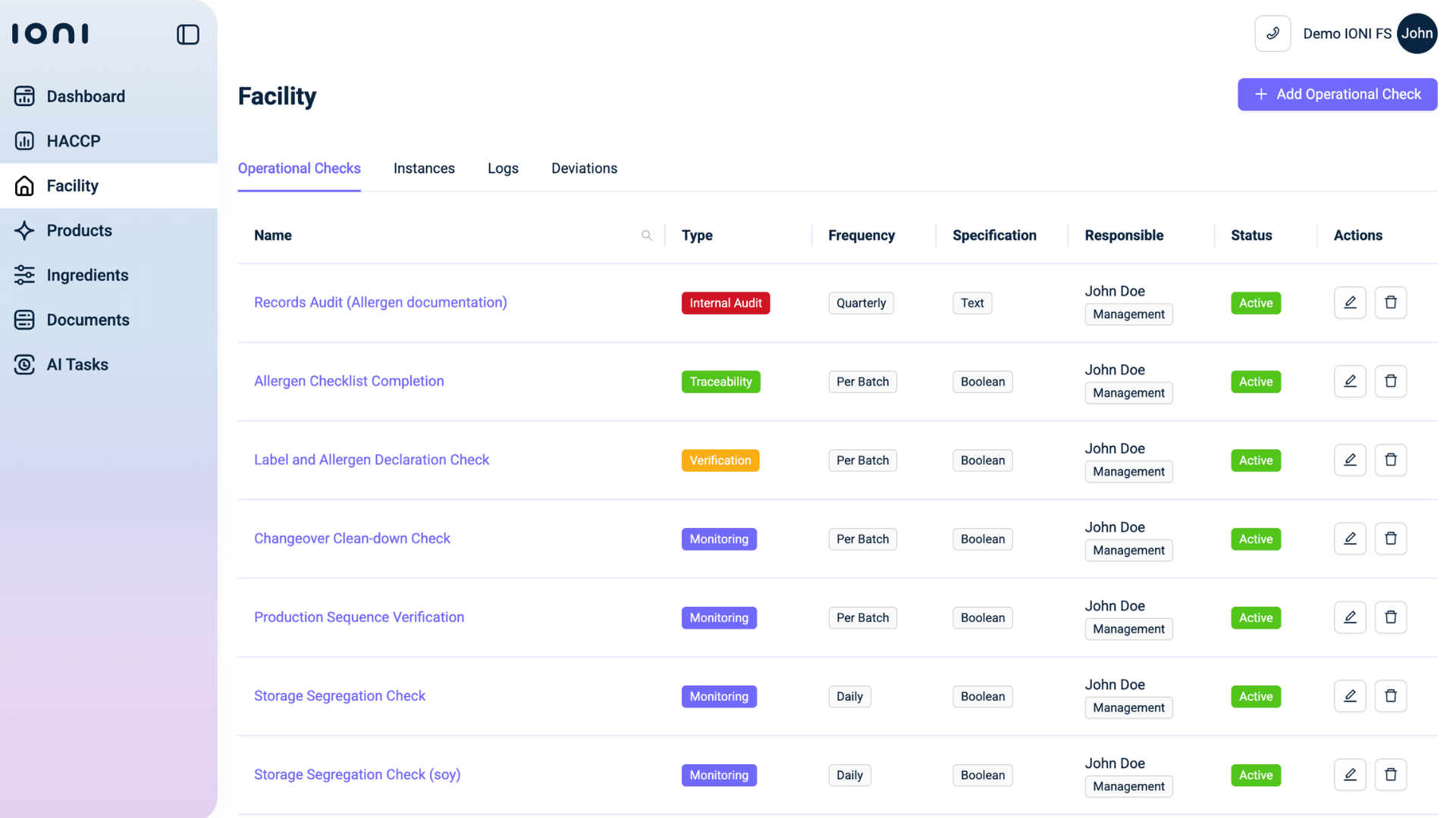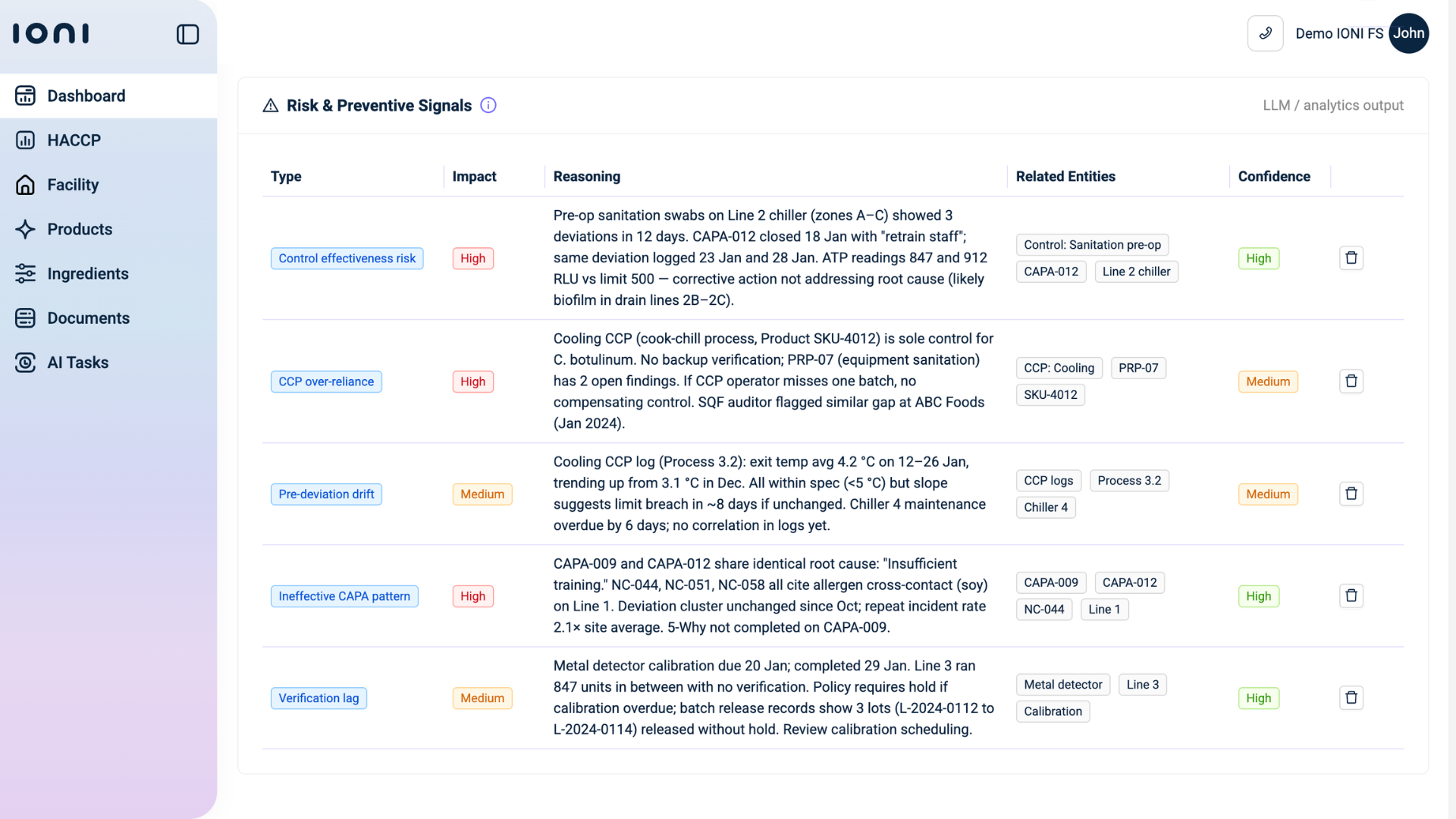 From a governance perspective, IONI centralizes ingredient compliance management into a single structured environment. Regulatory updates, supplier performance trends, contaminant drift, allergen consistency, and traceability data are visible within one system rather than scattered across spreadsheets and shared drives.