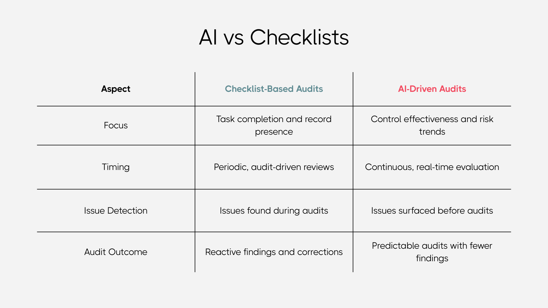 Checklists are not the enemy. The checklist mindset is.A checklist asks, “Did you do it?” An AI system asks, “Did it work, and is it still working?” That shift produces a new audit model.
