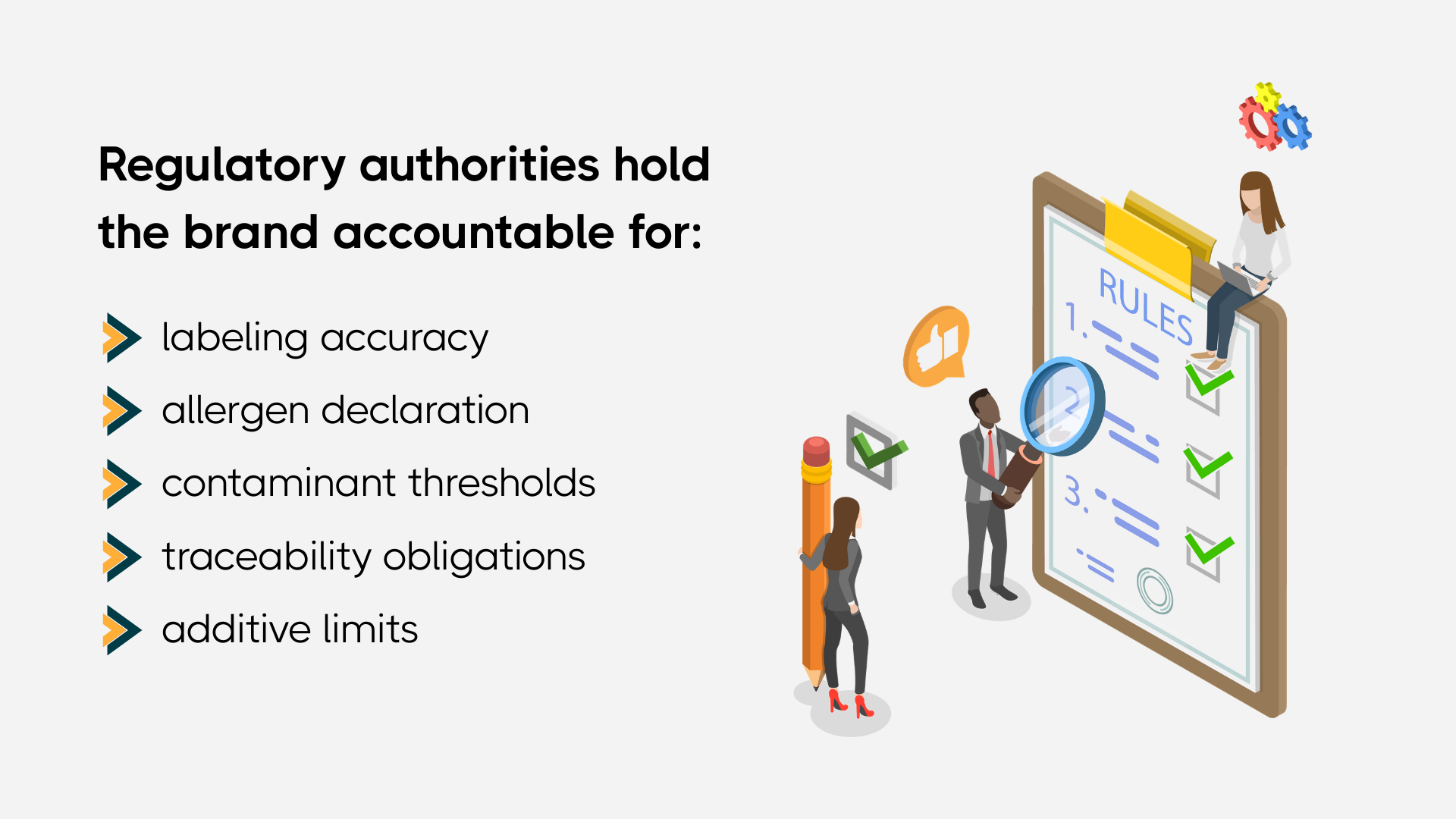 However, regulatory authorities will still hold the brand accountable for labeling accuracy, allergen declaration, additive limits, contaminant thresholds, and traceability obligations.