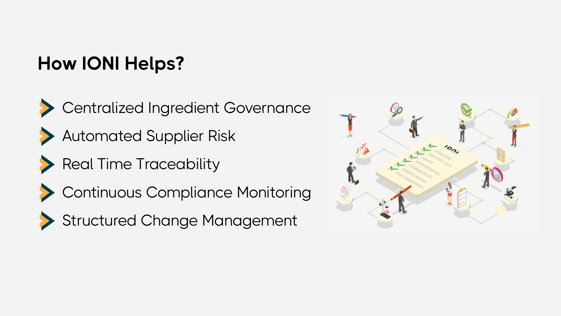 IONI makes the Ingredient Compliance Checklist executable. It transforms a conceptual control model into a daily operational discipline. In a world where recall volumes have increased and regulators expect structured oversight, Ingredient Compliance must function as a monitored system with traceable accountability. When compliance becomes systematic, it stops being a cost center and becomes a stabilizing asset for growth.